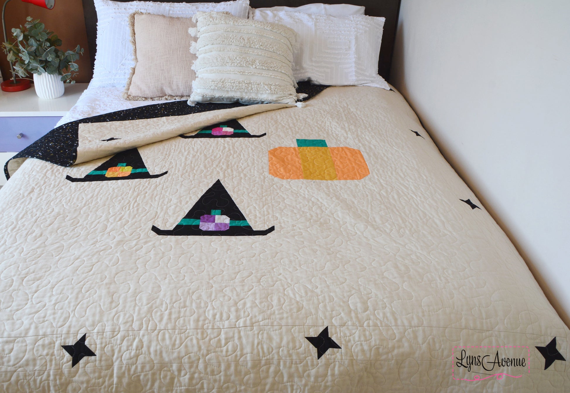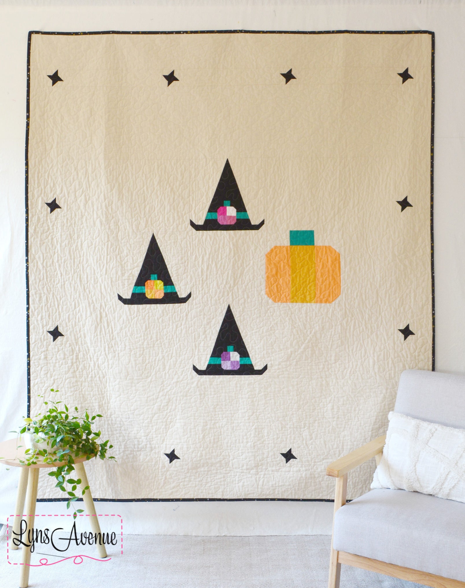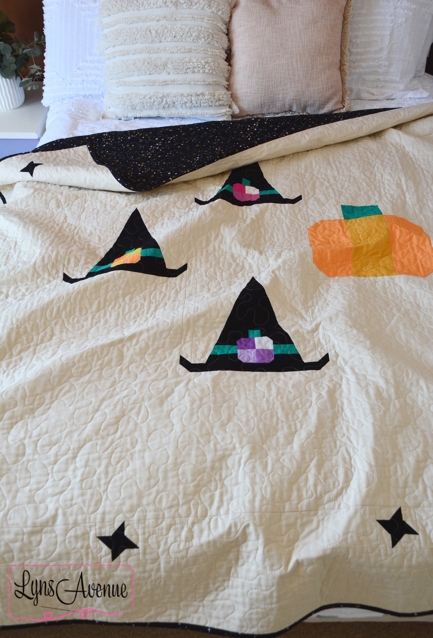 Celebrate the spooky season with the Coven Crown quilt pattern. Featuring whimsical witch hats adorned with the cutest little pumpkins gathered under the twinkling starry sky. Coven Crown quilt pattern is the perfect mix of cozy and cute making it perfect for snuggling under on the couch or adding a touch of magic to your halloween decor. Creating this pattern was so much fun and l hope you enjoy making it just as much.
