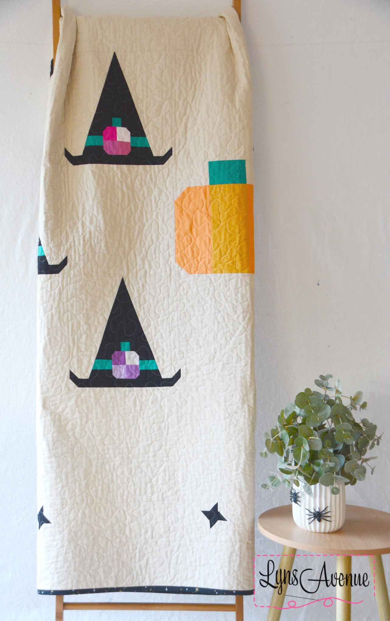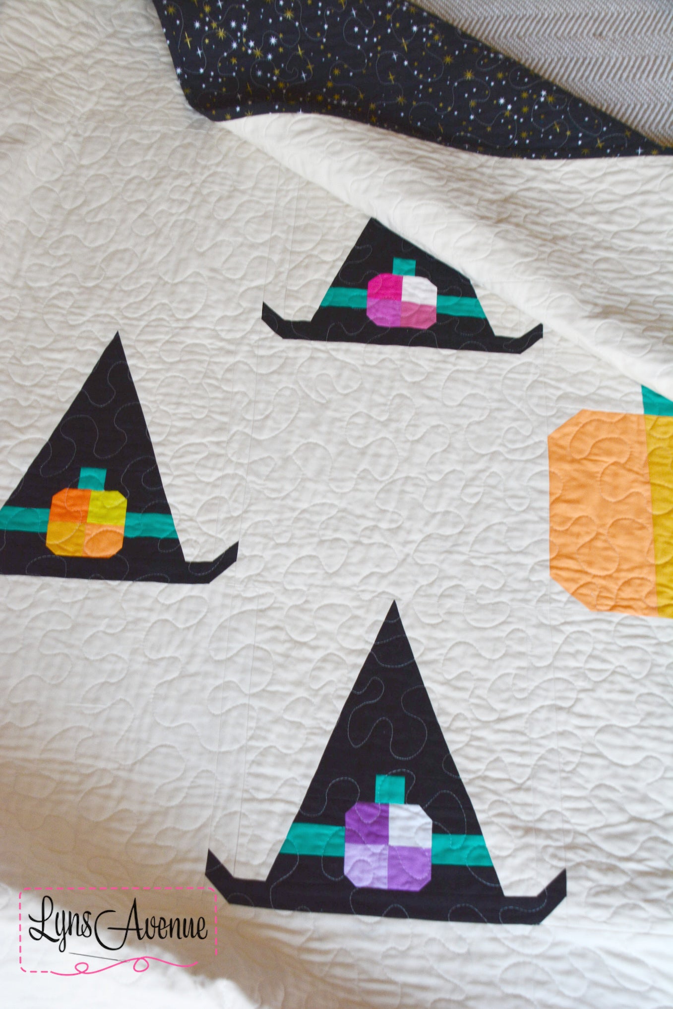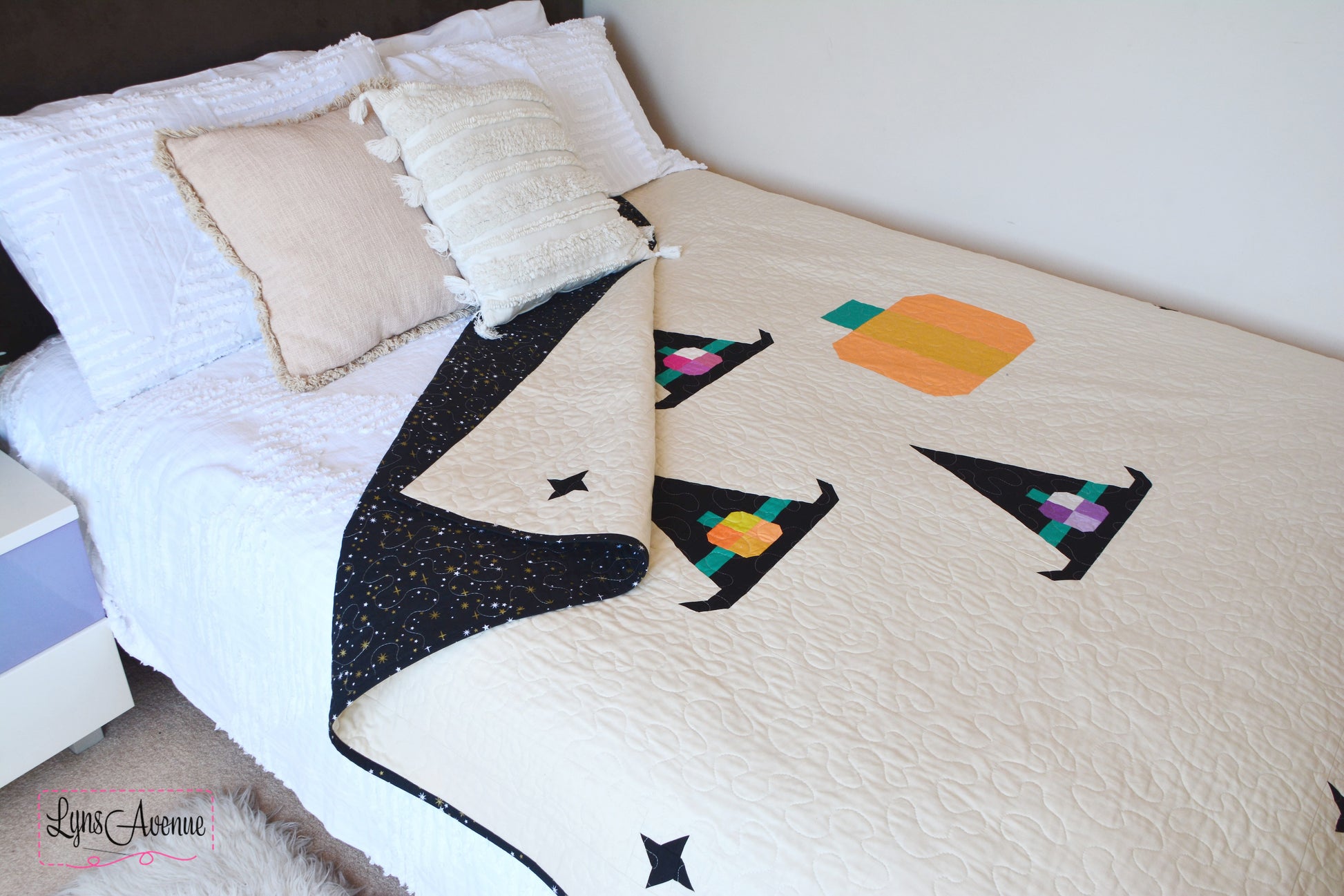 Celebrate the spooky season with the Coven Crown quilt pattern. Featuring whimsical witch hats adorned with the cutest little pumpkins gathered under the twinkling starry sky. Coven Crown quilt pattern is the perfect mix of cozy and cute making it perfect for snuggling under on the couch or adding a touch of magic to your halloween decor. Creating this pattern was so much fun and l hope you enjoy making it just as much.