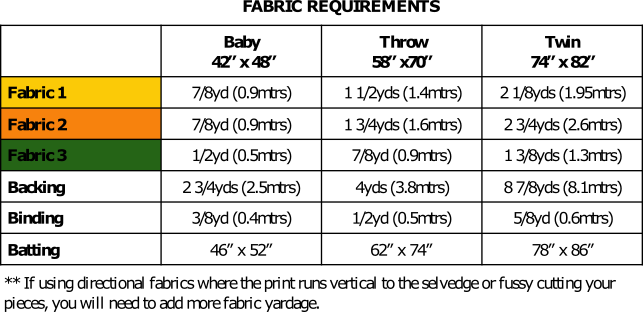 - Pattern assumes Width of Fabric to be 42", if using directional fabric or fussy cutting your pieces, please allow for more yardage